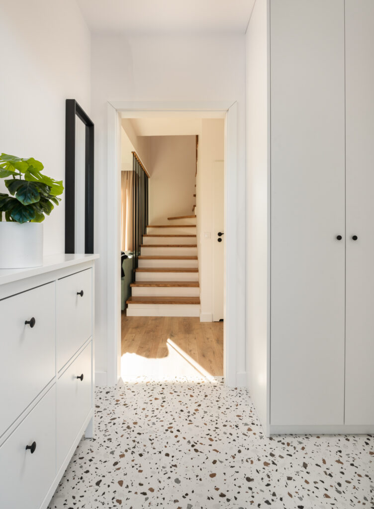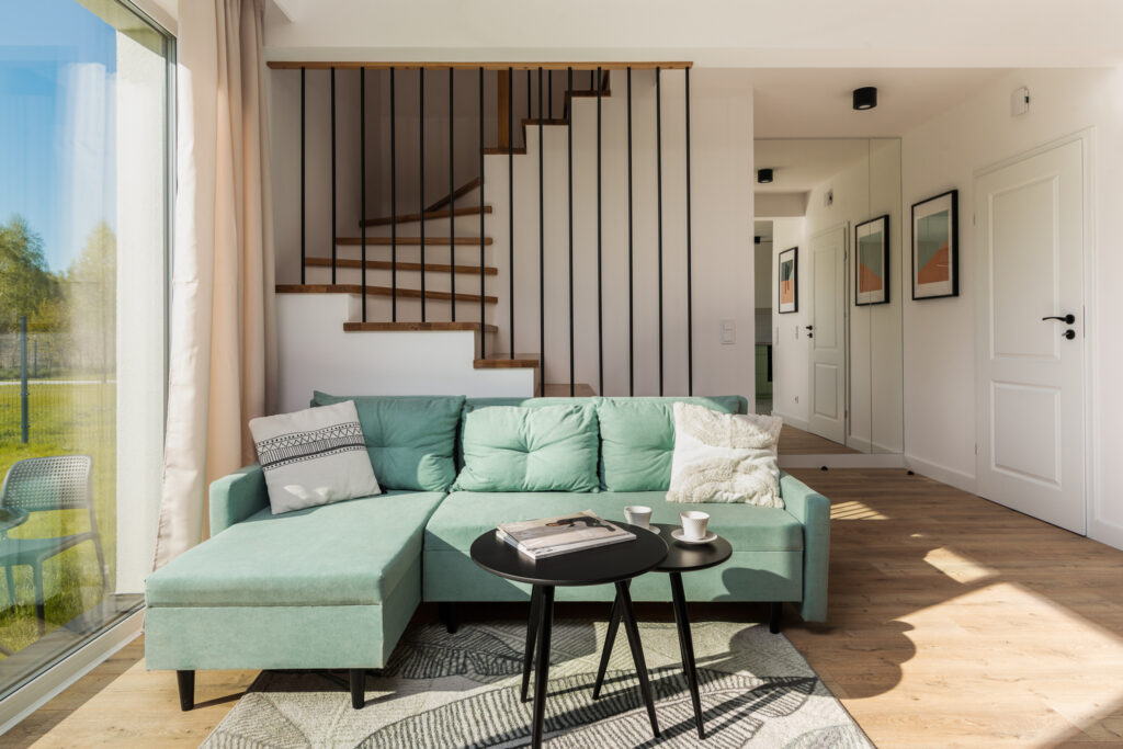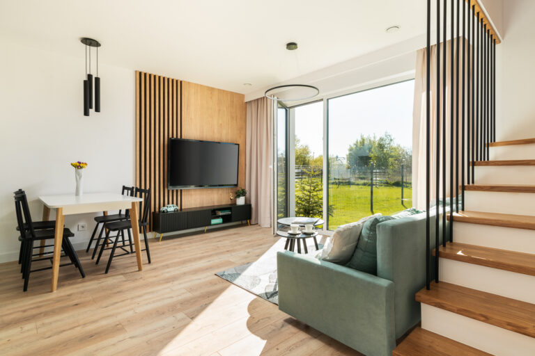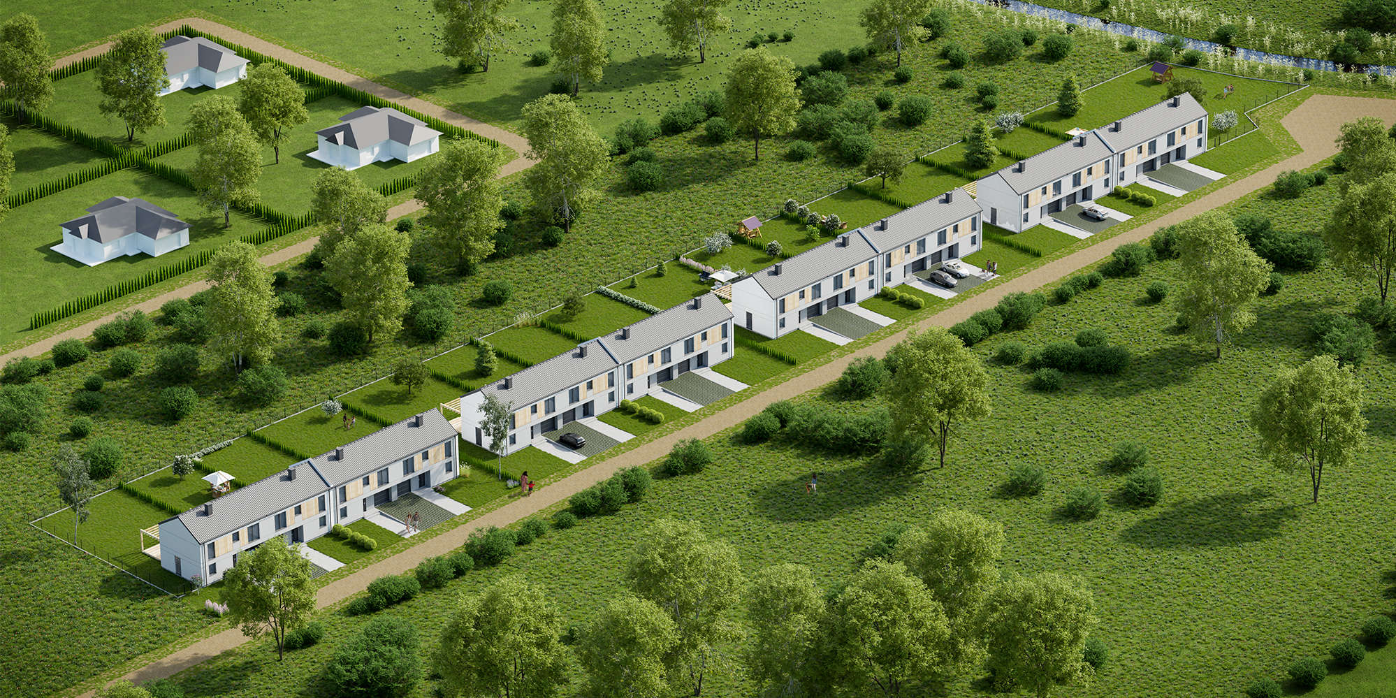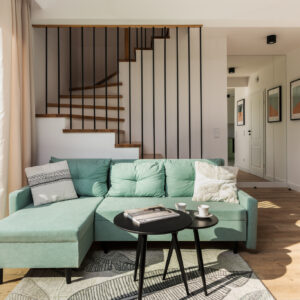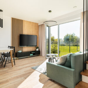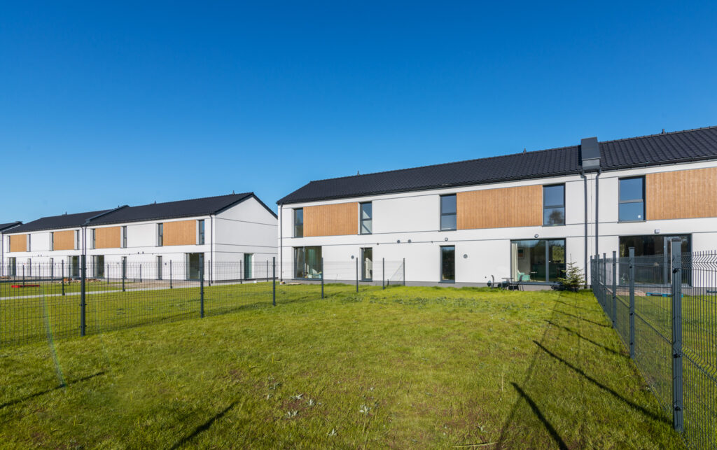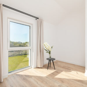 Układ naszego domu jest bardzo przemyślany – parter to otwarta część dzienna z wielkim oknem na ogród. Piętro to 4 sypialnie – każda z dużym oknem oraz miejscem na przestronną szafę. Skrajne segmenty mają 450 m² działki i 300 m² ogrodu. Segmenty środkowe to 350 m² działki i 200 m² ogrodu.