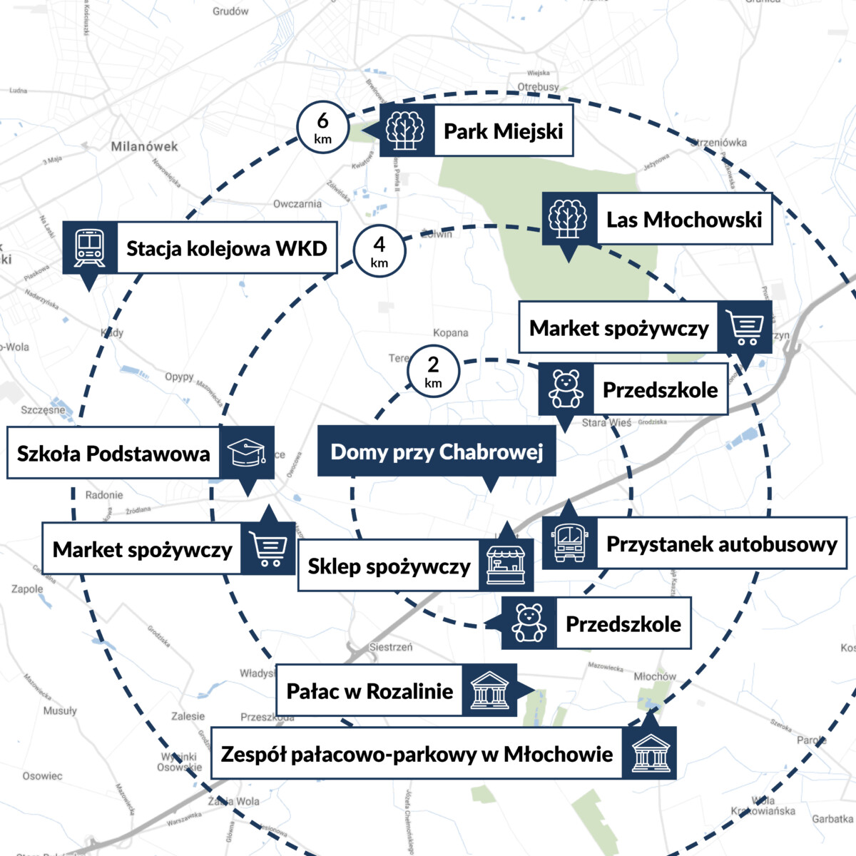 Zamieszkaj w bezpośredniej bliskości miasta, na terenie Warszawskiego Obszaru Chronionego Krajobrazu – masz stąd zaledwie 2 km do granicy kompleksu Lasów Młochowskich, 15 km do granic Warszawy i zaledwie 25 minut samochodem do Galerii Mokotów, czy stacji metra Stokłosy (parking Park&Ride).